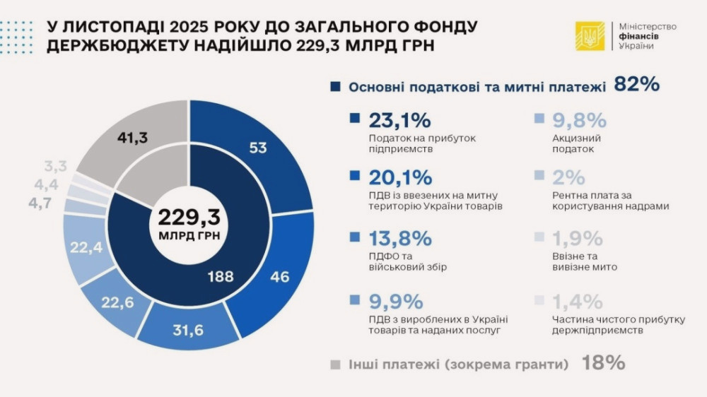 В цілому, за підсумками січня-листопад 2025 року, до загального та спеціального фондів бюджету надійшло 3,3 трлн грн податків, зборів та інших платежів. Касові витрати бюджету за цей період становили 4,54 трлн грн, з яких 3,54 трлн грн – з загального фонду.