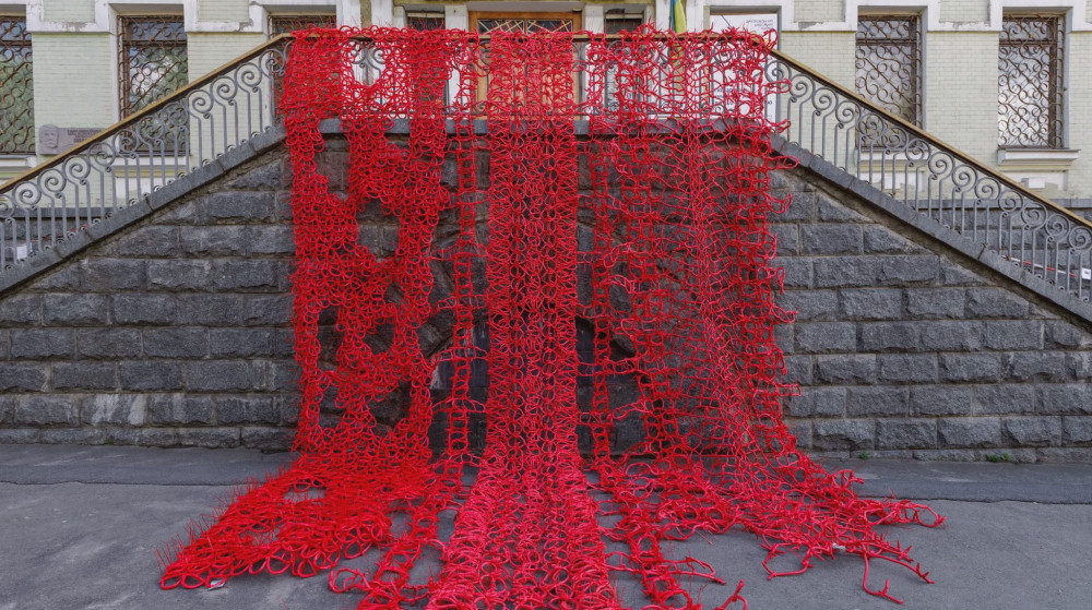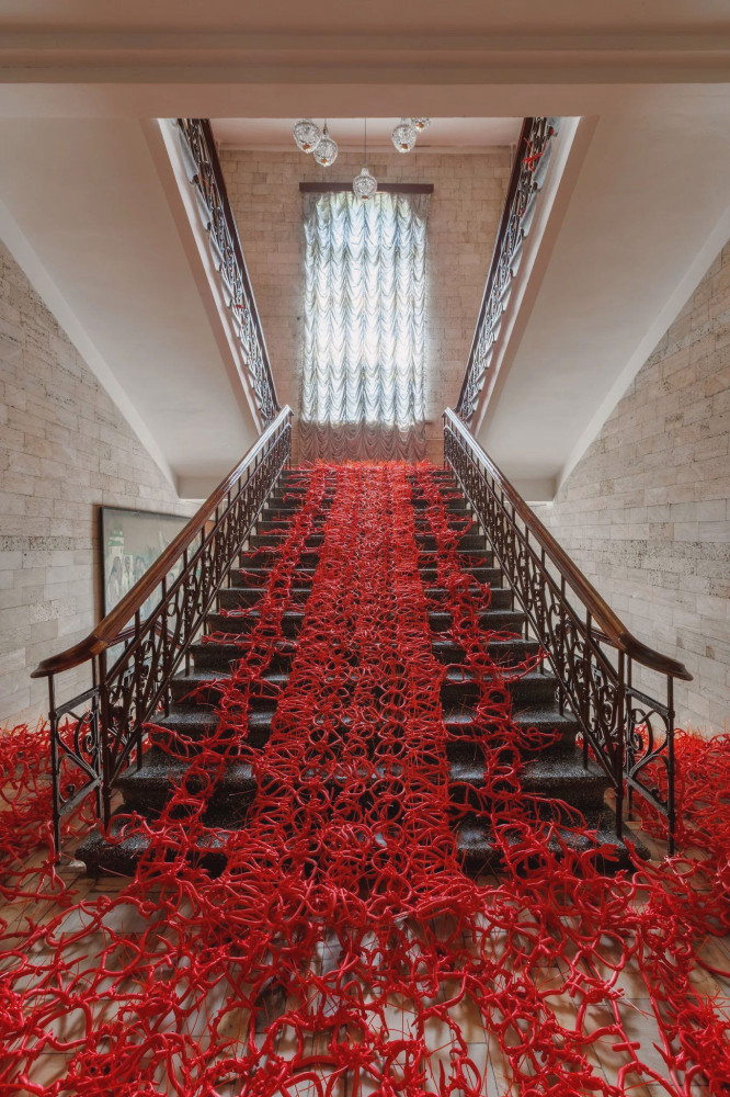"Ця робота стає живою артерією, що обвиває сходи та стіни, звертаючись до тем війни, пам'яті, крові та втрат", – написав митец.