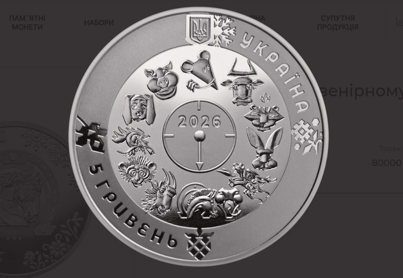 На аверсі монети зображені 12 символів східного календаря, а в центрі – стилізовані годинники зі стрілкою, що вказує на знак китайського зодіаку 2026 року.