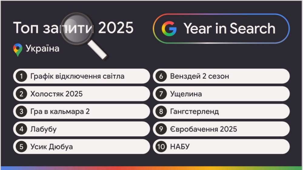 На першій позиції, як і минулого року, опинився запит «Розклад відключення електрики». Друге місце зайняв телепроєкт «Холостяк 2025», а третє - серіал «Гра в кальмара 2».